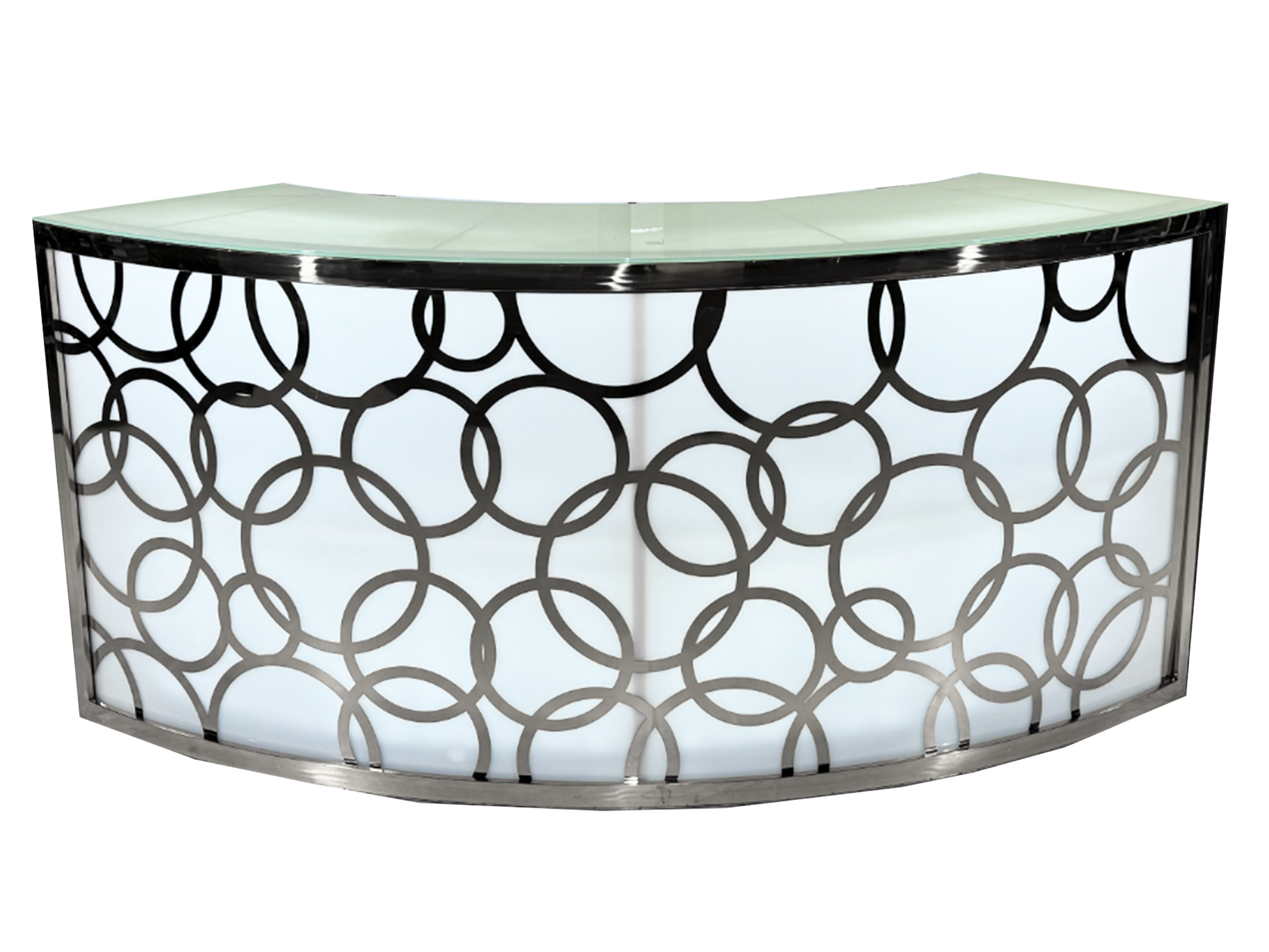 Set the perfect mood and ambiance with the LLL SKYY Loop Quarter Circle Bar in Silver. This fully customizable and brandable metallic framed bar with circular ring design will create the perfect high-end focal point that your space needs. With customizable LED lights so you can make it reflect your event colors. Whatever your preference, we have an option to suit.