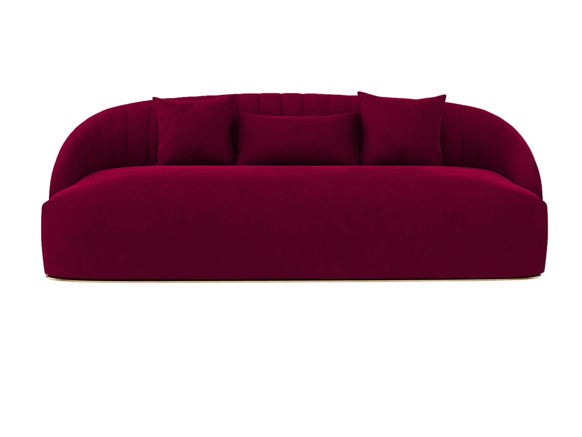 The World Sofa in Burgundy features plush velvet material, a channel tufted backrest, and a gold base. Perfect for any event.